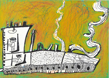 A baseline organizes objects such as people, houses, and nature on a single platform line that run horizontally across the artwork’s composition.